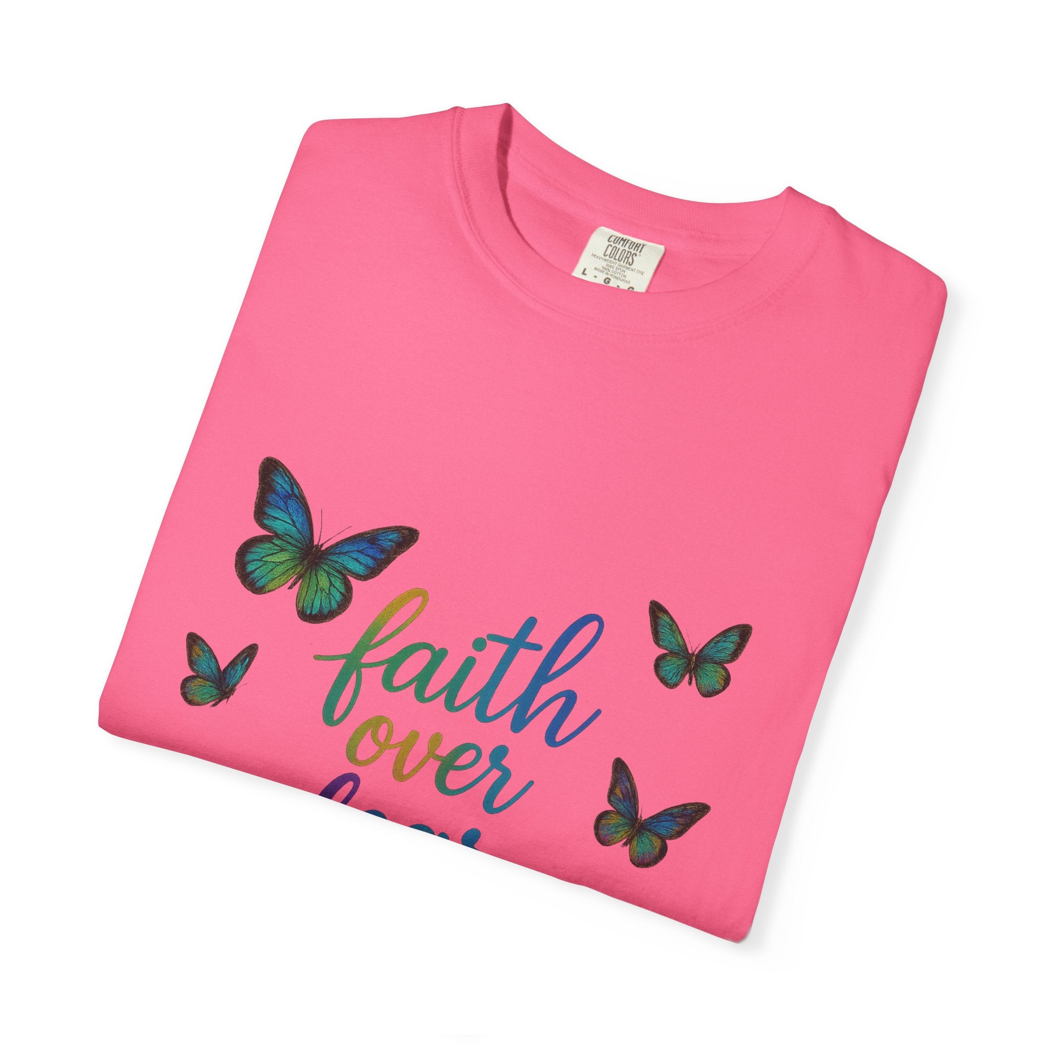 This relaxed, garment-dyed tee carries a gentle message: faith over fear. Soft, lived-in cotton and a lightweight drape make it feel like a longtime favorite from the first wear. The front art mixes a heartbeat line, a heart with a cross, and fluttering butterflies in watercolor tones — a quiet reminder to choose hope on anxious days. Wear it to calm mornings, community gatherings, or slow walks where gratitude and courage matter more than style statements. It layers easily under a cardigan or over a tank, and its roomy fit gives space to breathe — literally and figuratively.